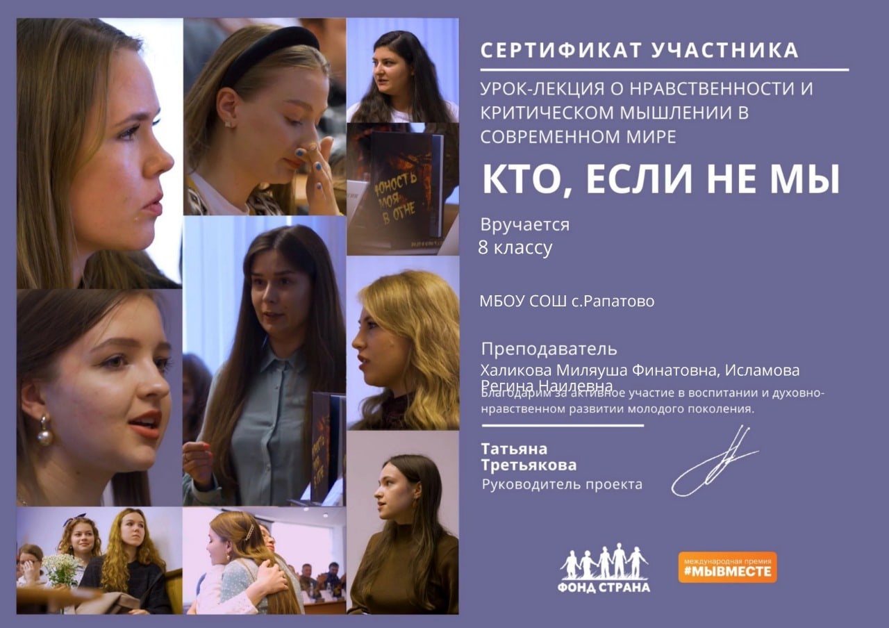 23 ноября в МБОУ СОШ с.Рапатово советником директора по воспитанию Халиковой М.Ф., заместителем директора по ВР Исламовой Р.Н. для учащихся 7,8 10 классов был организован просмотр и обсуждение мотивирующего цифрового урока "Кто, если не мы". Это цифровой урок-лекция о нравственности и критическом мышлении в современном мире создан на основе документальных материалов со встречи студентов Донецкого национального университета со студентами Уральского государственного архитектурно-художественного университета в 2022г. Она содержит реальные истории обычных ребят, которые в 2014 году, будучи совсем юными, были вынуждены в одночасье повзрослеть, когда к ним в дома пришла беда. Искренние эмоциональные рассказы передают взгляд изнутри событий, дают почву для размышлений, почему в сложной жизненной ситуации важно продолжать жить, получать знания, и при этом, развивать критическое мышление, учиться воспринимать разную информацию, вычленять главное и правдивое изложение происходящих событий.