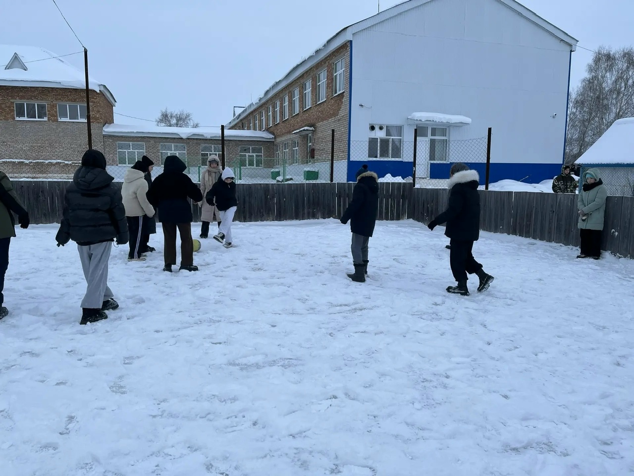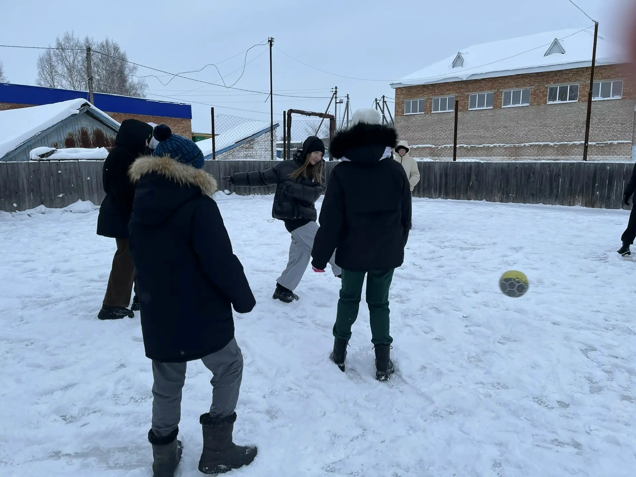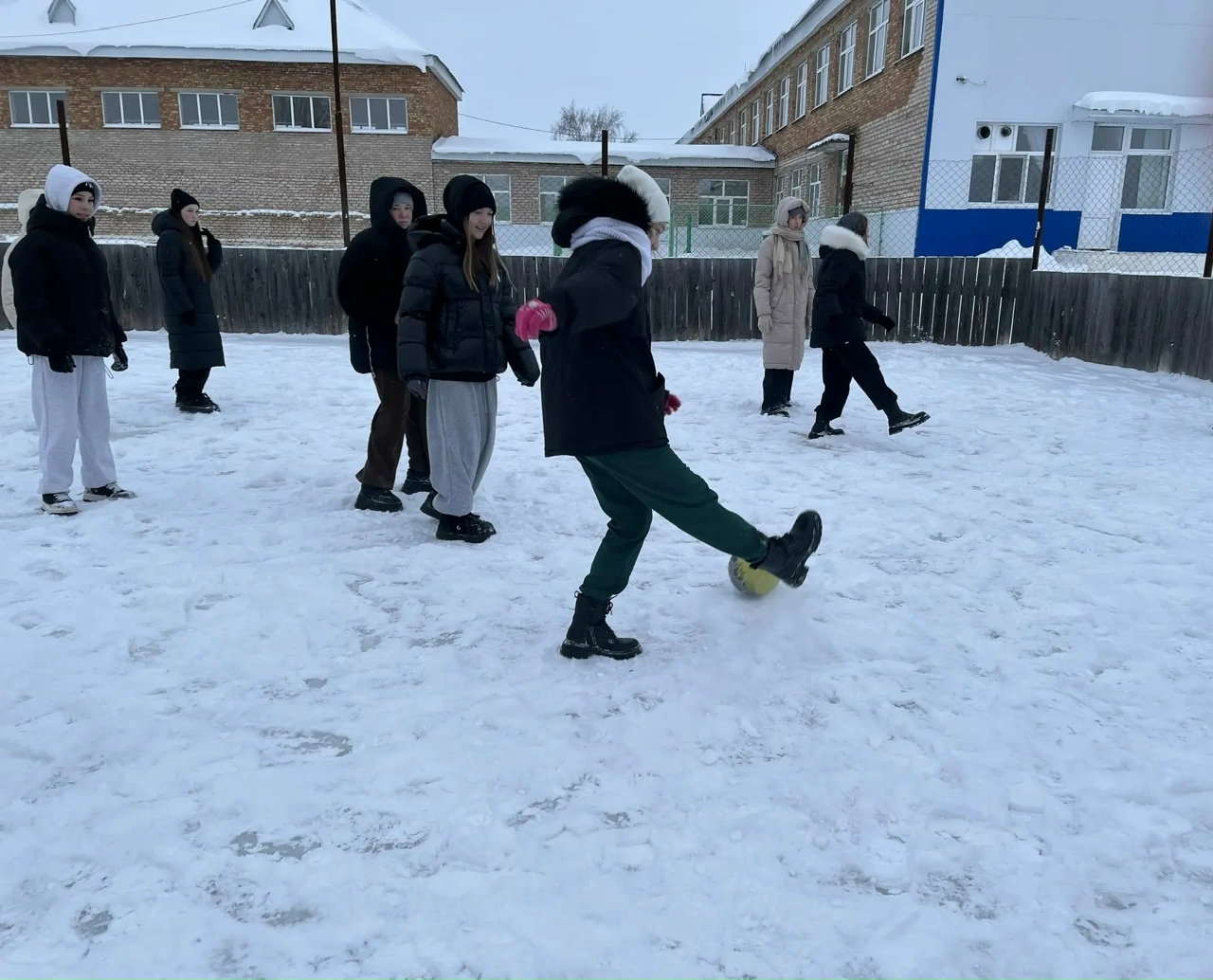 В дни зимних каникул на территории школы ребята поиграли в футбол на снегу.